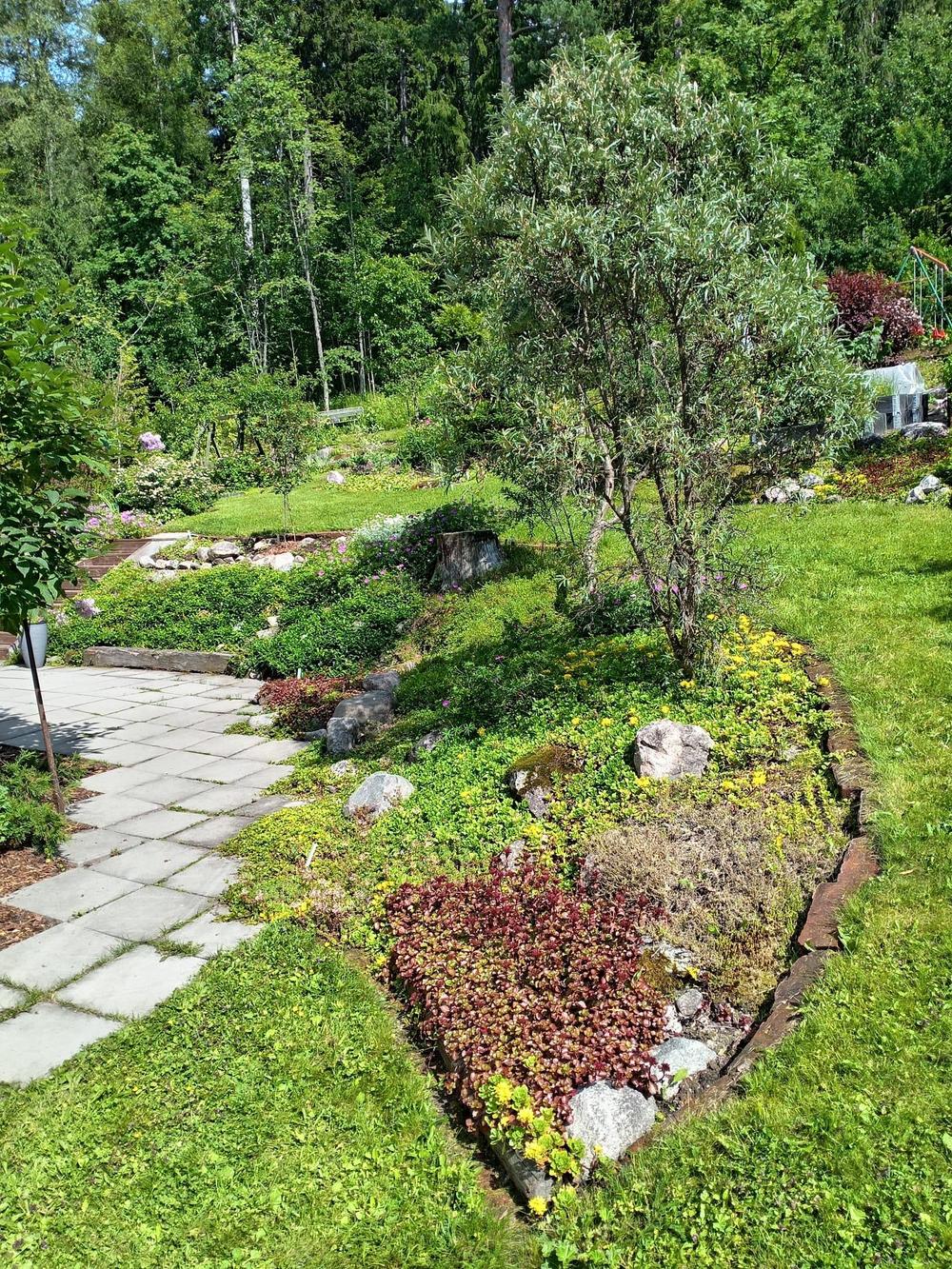 Kuvaus puutarhasta: | Länsirinnetontti, jossa rintamamiestalo. Polkuja, perennoja ja pieniä puita istutusalueissa. Vähitellen raivattu villiintyneestä ryteiköstä puutarhaksi. Perheen neljälle lapselle aktiviteetteja myös. |