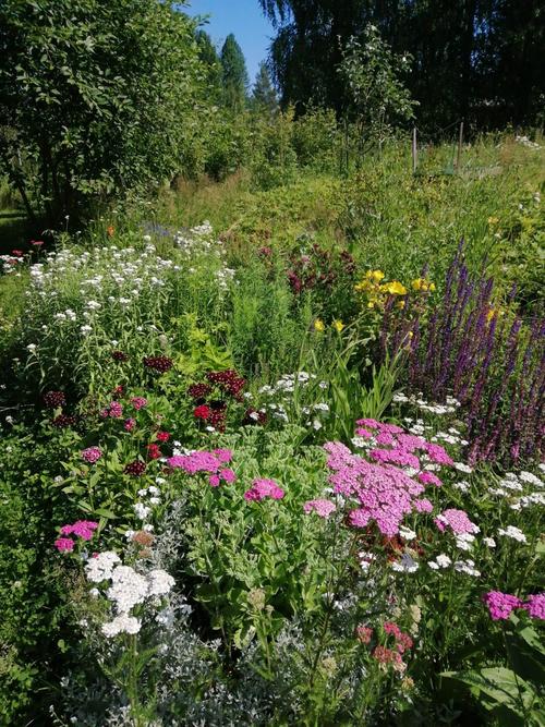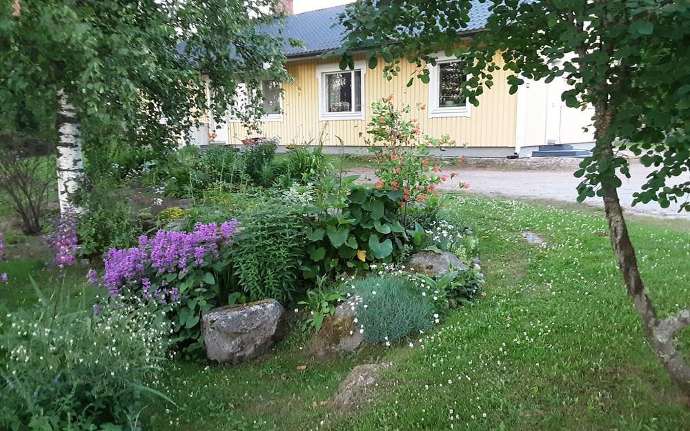 Kuvaus puutarhasta: | Vanhan maalaistalon ja 2004 valmistuneen talon yhteinen piha. Kukkapenkkejä ja puuvartisia kasveja on runsaasti rakennusten ympärillä. Hyötykasveja pihassa ei juuri sovi olemaan, erilaisia monivuotisia kasveja on yli 2000. Oheiskasvejakin (=rikkaruohot) viljellään nykyisin entistä enemmän! |