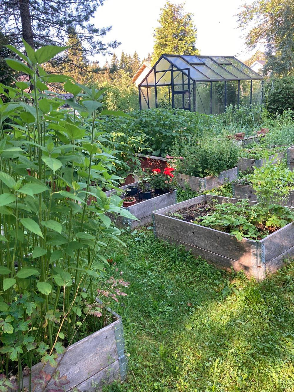 Kuvaus puutarhasta: | Rintamamiestalon puutarha, jossa kasvaa monenlaista syötävää hyötykasvia; marjapensaita, hedelmäpuita, pähkinäpensaita ja kasvihuoneessa myös viiniköynnöksiä. Hoidamme puutarhaa hiiliviisaasti ja mm. iso puutarhakomposti on tehokkaassa käytössä. |